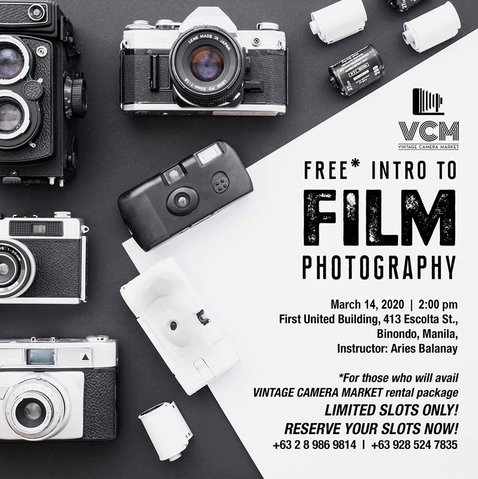 Vintage Camera Market will be holding a workshop for Introducton to film Photography by Aries Balanay on March 14, 2020, 2:00 pm.It will be a combination of lecture and a photo walk.Camera rental package are available for rent at Php. 1,000 only which includes SLR Camera, 135 mm film - 36 shots, film developing, scanning and fb uploading.
